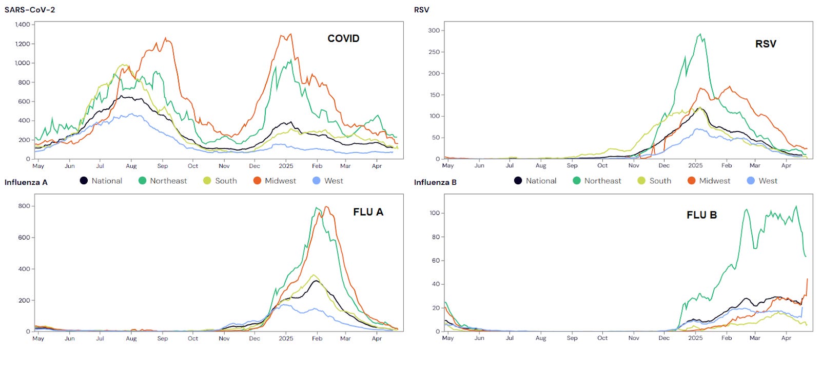 "This week, the CDC reports LOW overall levels of respiratory illness with COVID, RSV, and influenza hospitalizations are trending downward nationally. Influenza B remains more prevalent than Influenza A especially in the Northeast, but levels are decreasing.