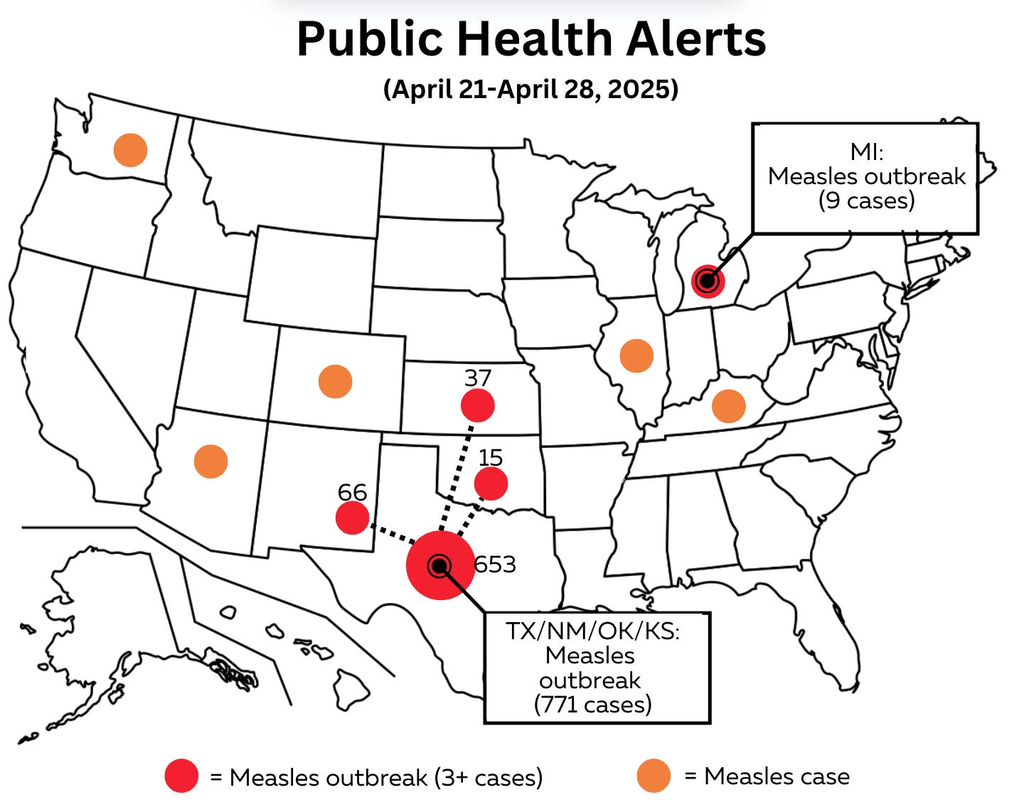 "As of 4/24/25, the CDC reports 884 reported US measles cases
