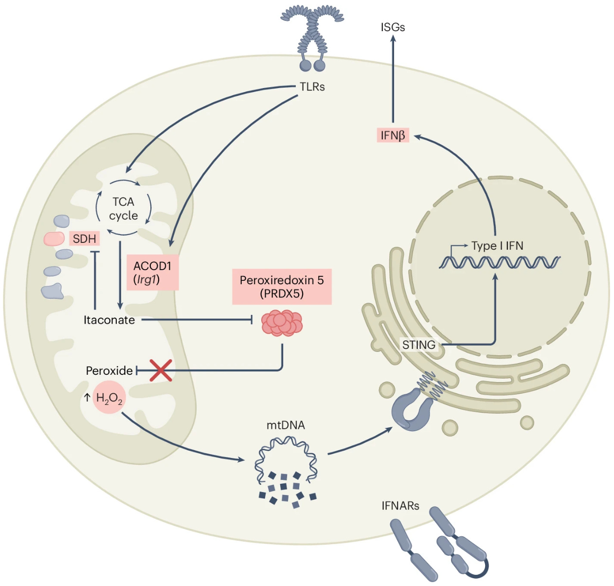 "A new study shows that the immune-regulating molecule itaconate boosts the type I interferon (IFN) response by inhibiting the antioxidant enzyme PRDX5 in macrophages. This inhibition increases hydrogen peroxide levels, which leads to mitochondrial DNA leakage and activation of the STING pathway, ultimately enhancing IFN production. These findings reveal a novel link between redox signaling and immune activation and suggest that itaconate could be a promising therapeutic tool for inflammatory diseases.