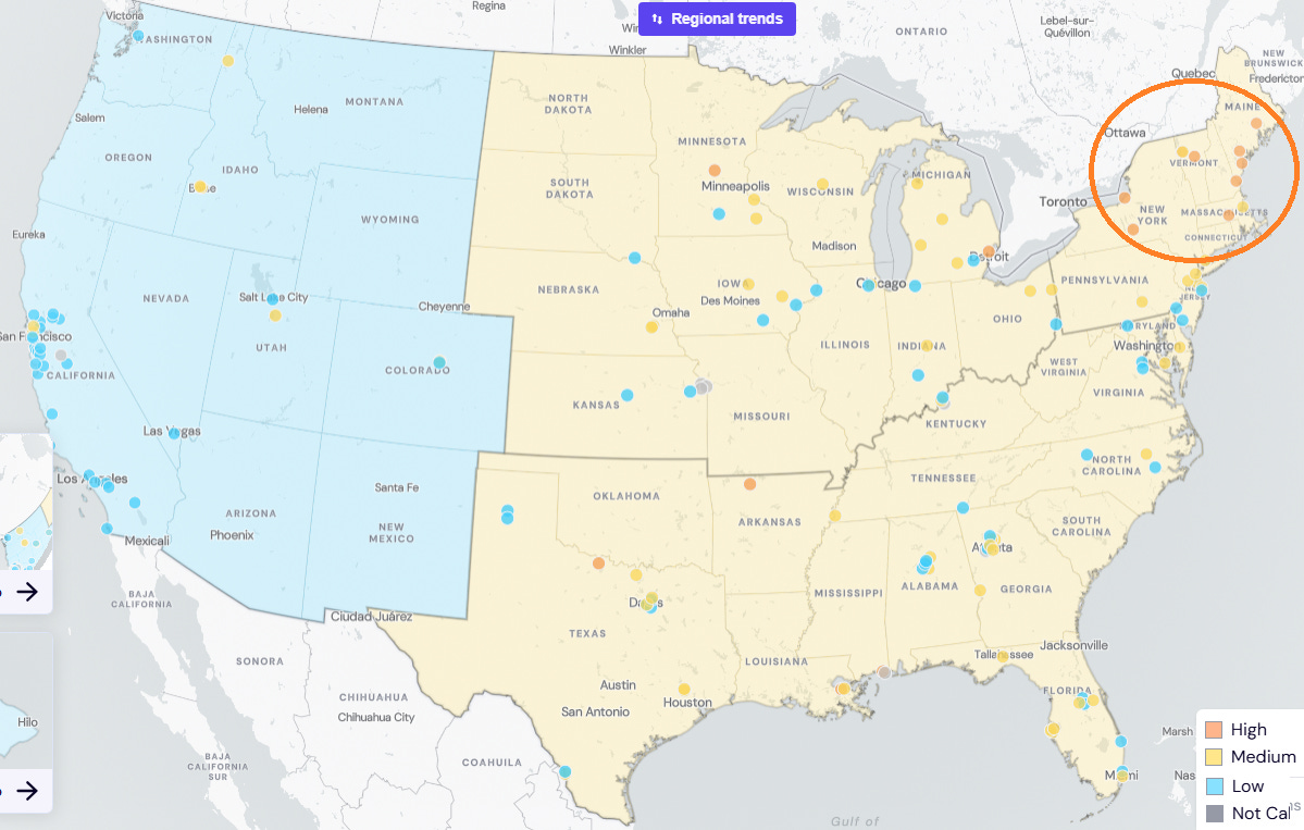 "WastewaterSCAN shows that SARS-CoV-2 levels are low in the West and are medium in the rest of the country. High levels are seen in some of the Northeastern states including Vermont, Maine, Massachusetts and New York state. WastewaterSCAN does not provide COVID wastewater levels for 12 states. California wastewater SARS-CoV-2 levels are low across the state per CDPH with high levels in Novato, Hollister, Woodland and Cambria.