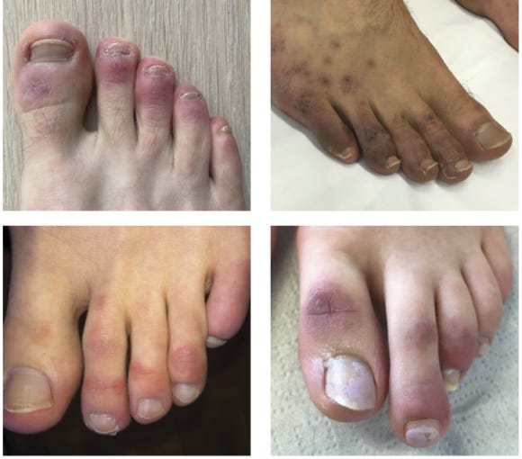 "Remember COVID toes? During the COVID-19 pandemic, researchers noticed a spike in cases of chilblains- painful, red skin lesions also called “COVID toes.” A study has found that people with pandemic chilblains have an unusually strong immune response to single-stranded RNA viruses like SARS-CoV-2, driven by overactive plasmacytoid dendritic cells (pDCs) responding to TLR7 signals. These individuals likely cleared the virus early with innate immunity, before developing antibodies, but the inflammation triggered chilblains in their toes.