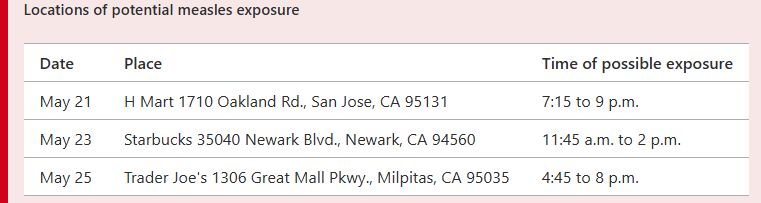 "On Thursday, Santa Clara County warned about a case of measles in a person who tested positive after international travel. People who are unvaccinated and who visited the following sites may be at risk. Symptoms of measles include fever, cough, runny nose, conjunctivitis (red eyes), and a rash which usually appears 10 to 21 days after exposure. Call before going to a medical facility if you have been exposed to measles, so that they can take measures to protect other patients and visitors. Two doses of the MMR vaccine protect 97% against the measles.