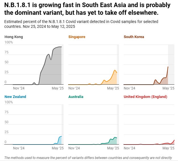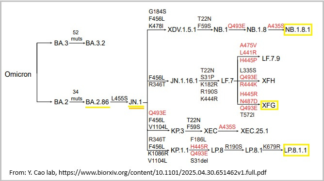 "NB.1.8.1 (recently nicknamed "Nimbus"), by Prof. Lara Herrero of Griffith University, is causing major waves in Asia now. According to Yunlong Cao’s preprint from May 1, NB.1.8.1 combines high ACE2-binding efficiency with significant immune escape, giving it a strong advantage for dominance.