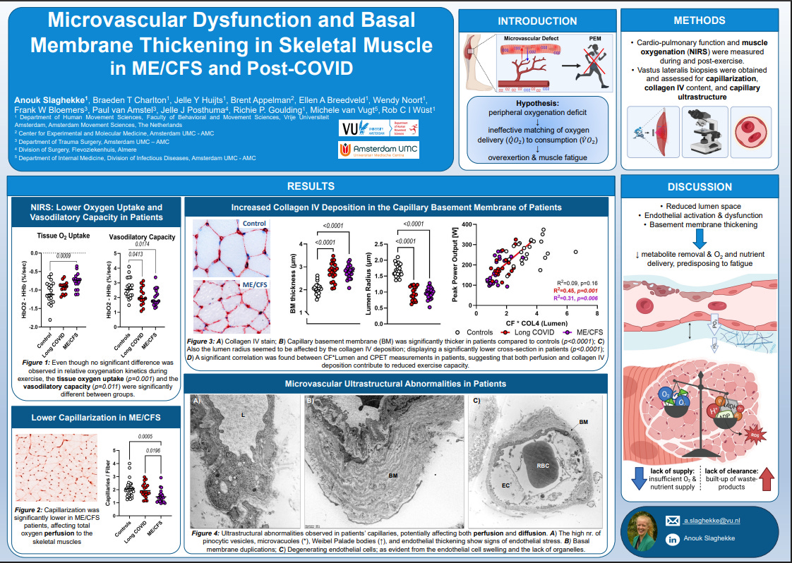 "Anouk Slaghekke from Rob Wust’s lab in the Netherlands won first prize at the recent International ME/CFS Conference at Charite Berlin for her poster entitled "Microvascular Dysfunction and Basal Membrane Thickening in Skeletal Muscle in ME/CFS and Post-COVID". Her poster showed that patients with Long COVID and ME/CFS have abnormal deposition of Collagen IV in the basement membranes of their capillaries in skeletal muscle. Endothelial cells lining the capillaries become activated and some start to degenerate and lose their organelles.