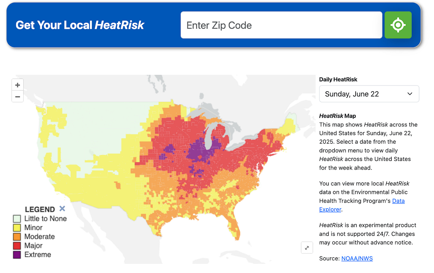 "Some federal tools to track heat-related illness were dismantled in 2025 with the firing of CDC employees, but the NOAA-CDC HeatRisk tool* is still active. It offers hyperlocal risk forecasts up to 7 days ahead, rating conditions from “No Risk” to “Extreme” by considering temperatures, humidity, and other factors. If you want a simple daily check-in or a forecast, put in your zip code.