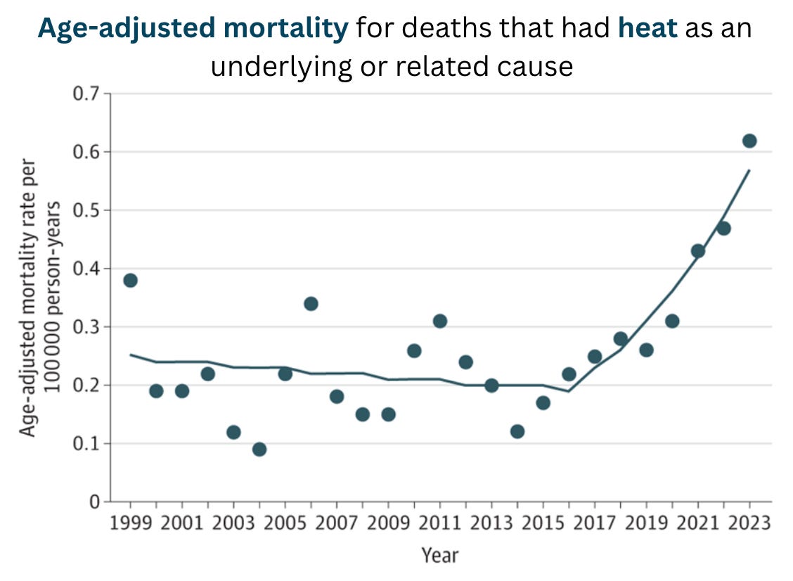 "Heat waves can be dangerous to health. They send more people to the ER with heat stroke, asthma attacks, dehydration, and heart problems. While relatively rare, they can also lead to death, which has increased over the past decade with more extreme heat. An increase in outside deaths largely drives this pattern. Indoor deaths are mostly among those without a working AC.