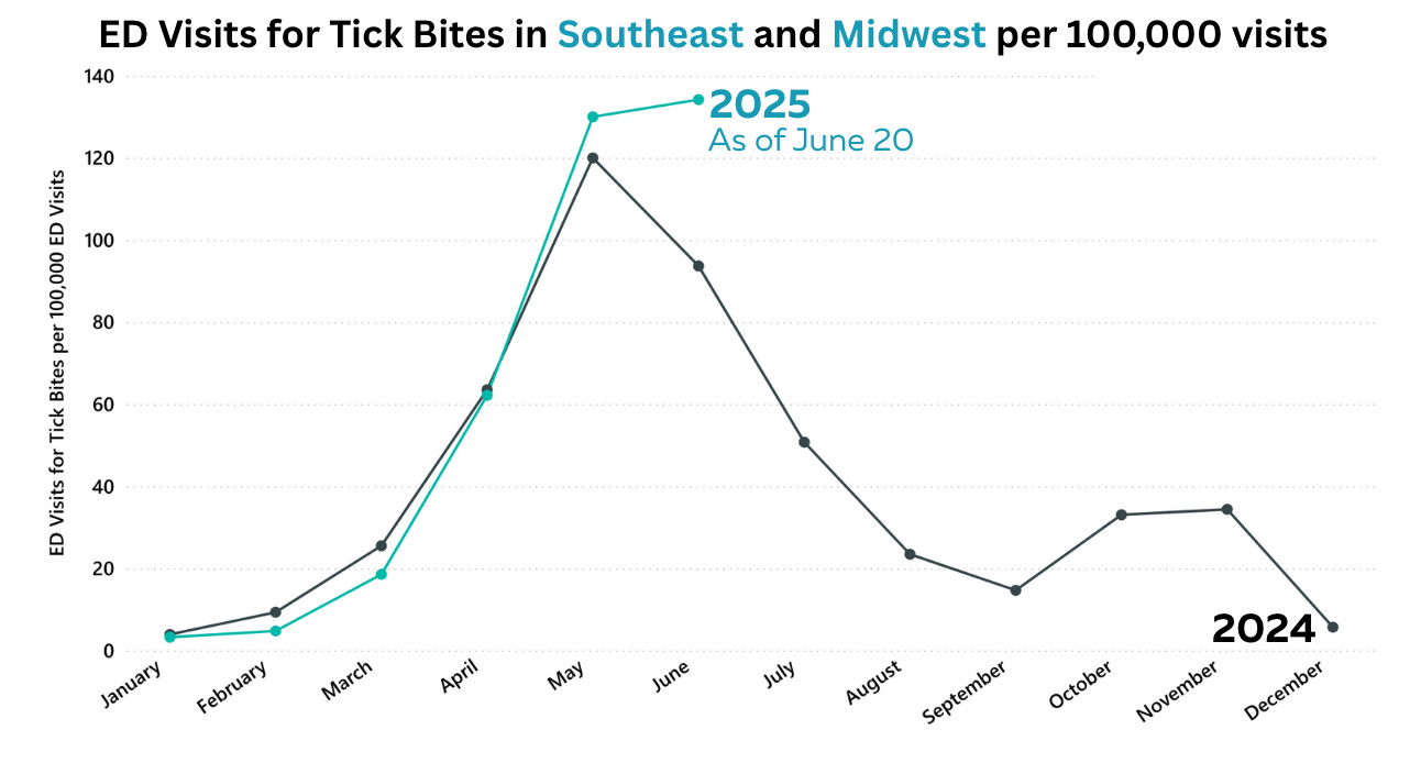 "Emergency department visits for tick-related disease are up 20% compared to the last two years. The Northeast is seeing the highest rates, with 257 ED visits for tick bites per 100,000 people (where most tick-borne diseases are). Normally, we’d expect numbers to drop by June, but rates remain stubbornly high in the Southeast and Midwest. I’m hopeful relief will come soon.