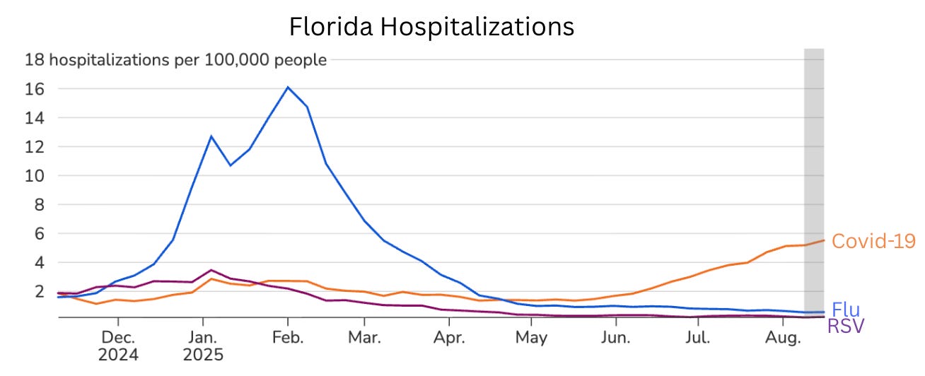 "Hospitalizations are also slowly rising, but still predominantly occur among those over 65 years old and infants. The states with the highest levels of hospitalizations are Hawaii (6.5 per 100,000), followed by Florida (5.5), reflecting their leading role in Covid-19 transmission and hinting at what may soon unfold nationally.
