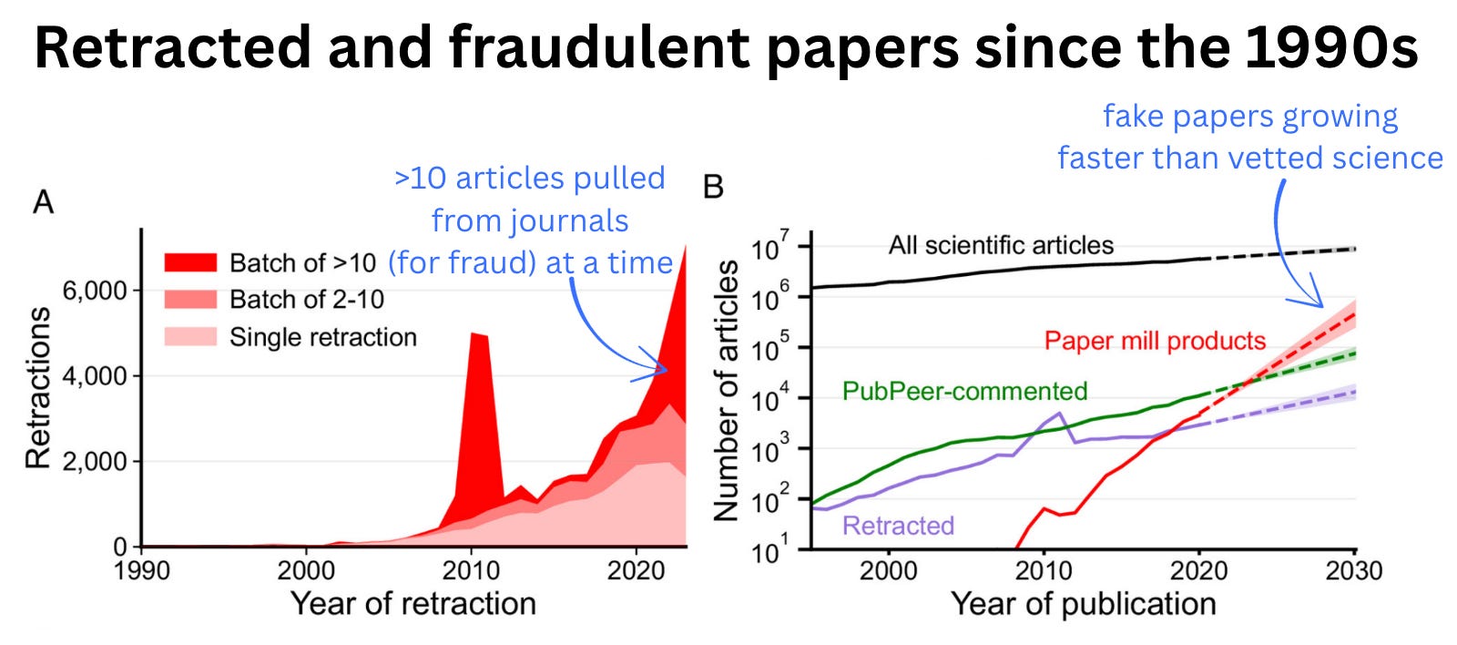 "Fake papers are doubling every year and a half, according to a recent study. “Paper mills” are publishing papers with fake data, images, and plagiarized writing—and they’re rapidly growing. The authors found evidence across almost every field, including CRISPR and mRNA research.