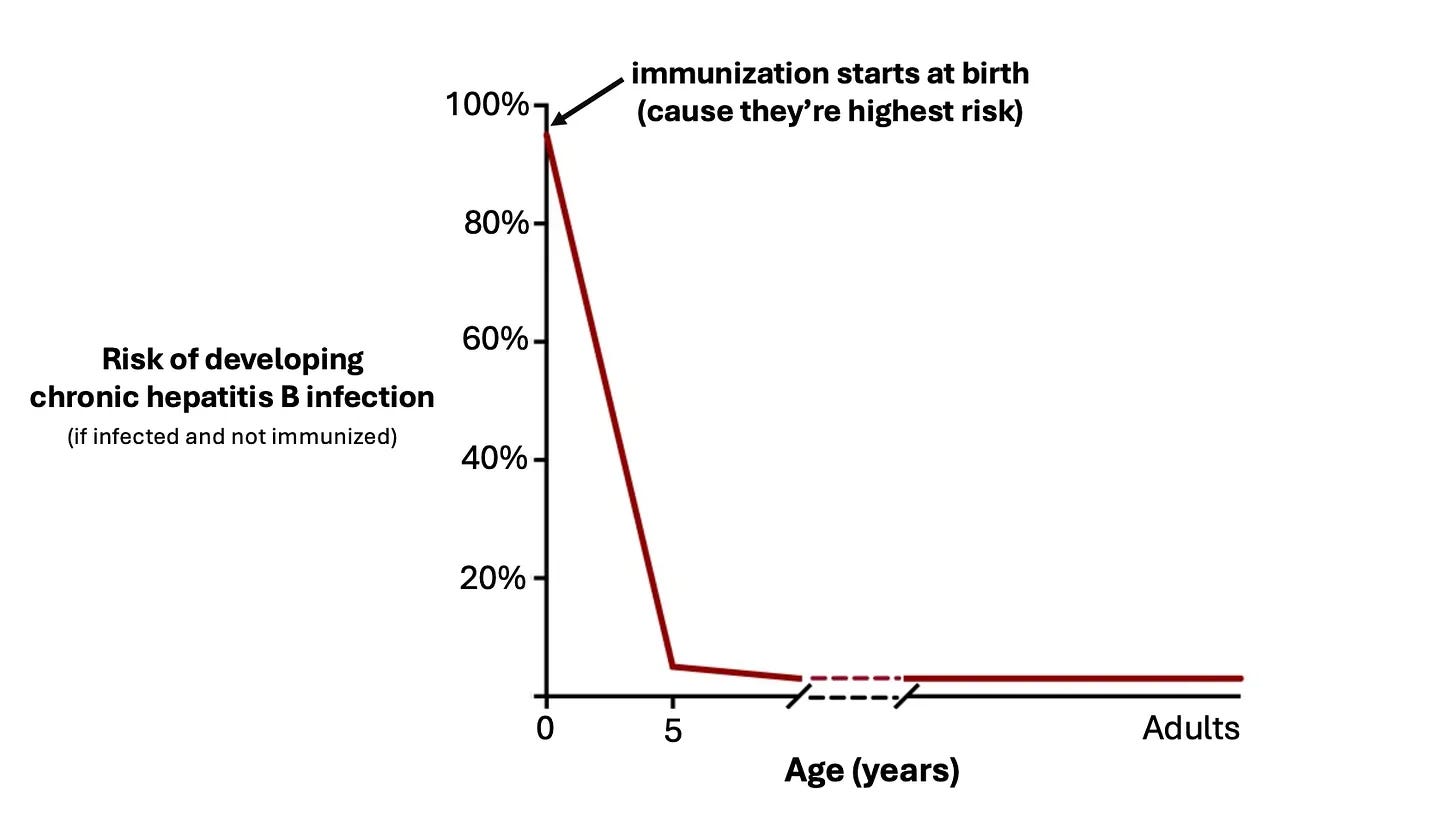 "In the 1980s, before the universal birth dose was recommended in 1991, about 18,000 children under age 10 were infected with hepatitis B each year—half of them at birth. Today, thanks to universal vaccination, CDC reports fewer than 20 cases per year (though modeling suggests the true number is still several hundred). Let me say that again: universal hepatitis B vaccination cut the number of children infected by 1000 times!