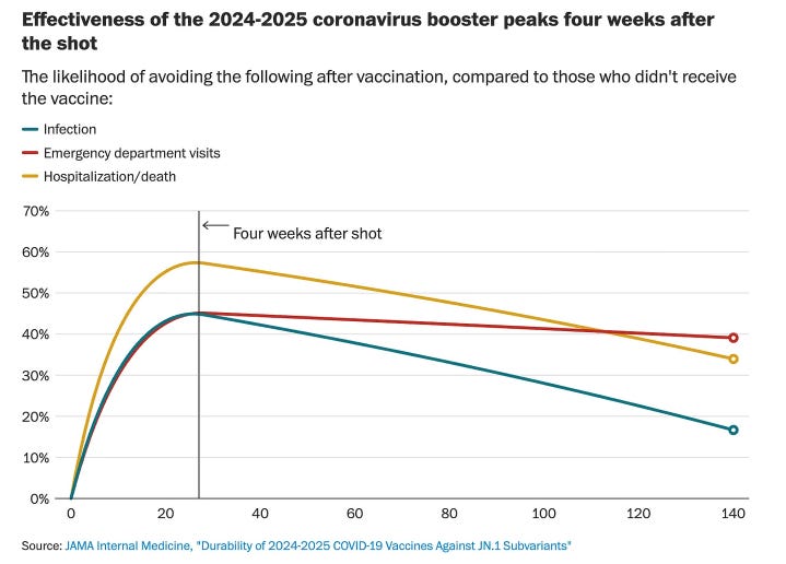A recent real world study of 1.8 million Americans looking at the efficacy of last year’s mRNA and Novavax COVID vaccines (2024-2025 vaccine) found that vaccine protection fades after about 4 to 5 months against both infection and severe illness. Adults over 65, who made up nearly 80% of hospitalizations, benefit most from getting updated COVID vaccines every six months. The study showed that COVID vaccine effectiveness against symptomatic infection went from 45% at 4 weeks post vaccination down to 17% by 12 weeks. Regarding Emergency Department visits, effectiveness was 45% at 4 weeks and decreased to 39% effective by 20 weeks. For hospitalization or death, effectiveness reached 57% at 4 weeks, was 50% at 10 weeks and decreased to 34% by 20 weeks post-vaccination.