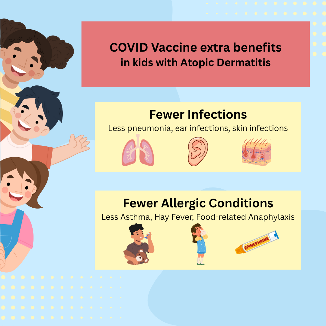 In a retrospective cohort study of 11,516 children with atopic dermatitis or eczema, COVID vaccinated children experienced lower rates of other infections (pneumonia, otitis media, and skin infections) and fewer allergic conditions (asthma, allergic rhinitis, and food-related anaphylaxis) compared to their unvaccinated peers. Researchers concluded that the COVID vaccine may offer broader health benefits to children.
