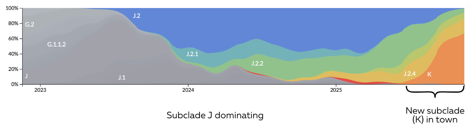 These numbers matter. Without them, we can’t accurately anticipate what’s coming: hospital strain, missed work, and the broader burden of a potential wave. State data give us a glimpse, though, and it’s not reassuring. New York, for example, is reporting vaccine uptake about 30% lower than this time last year.