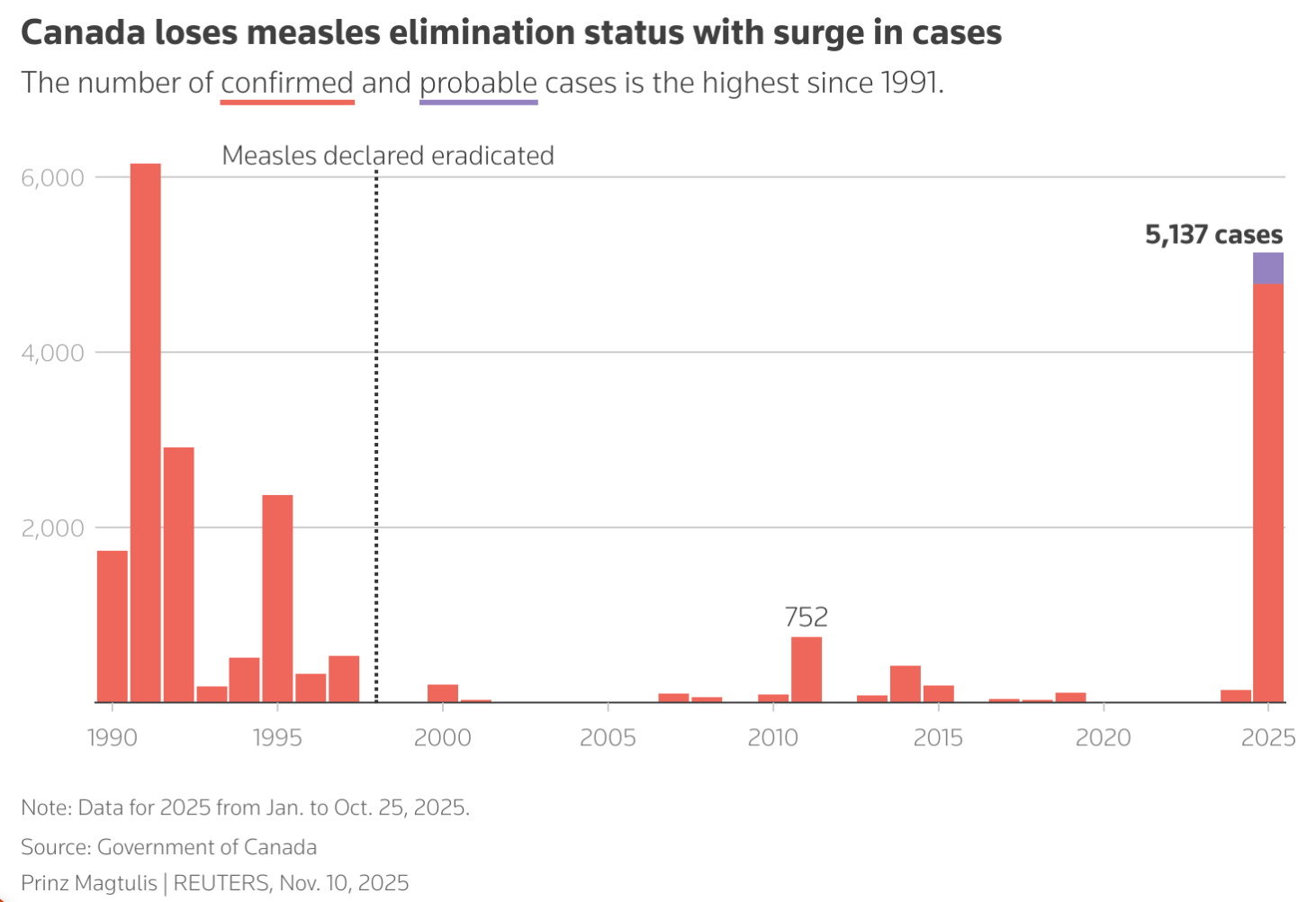 What does this mean for the U.S.? The Pan American Health Organization—the World Health Organization’s regional office for the Americas—will review the U.S. status in January. We’ve also seen the most annual cases (1,600+) since 1990. But elimination status isn’t determined by total case count—it depends on whether a single strain spreads continuously for 12 months. In other words, it requires sustained transmission of one outbreak, not multiple separate outbreaks seeded by travel. We don’t yet know whether the U.S. meets that threshold, and I’m looking forward to seeing the PAHO’s assessment.