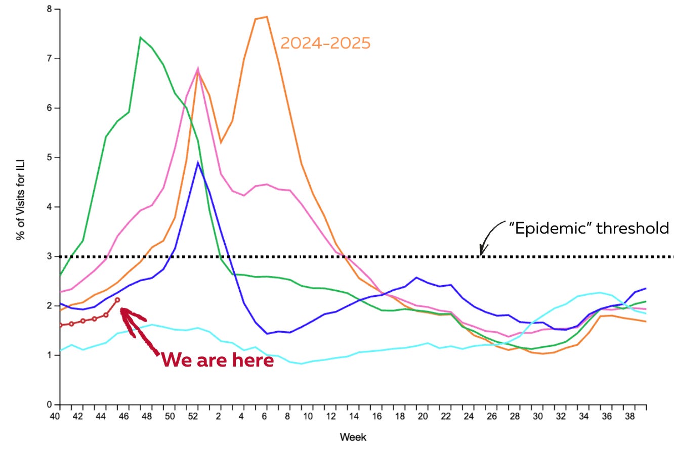ILI is starting to creep up (particularly in Louisiana and Southern states) but is still below the “epidemic” level threshold. (This threshold is usually when I put on my mask when I’m at airports or crowded indoor places, because I don’t have time to get sick.) In other words, things aren’t bad yet.