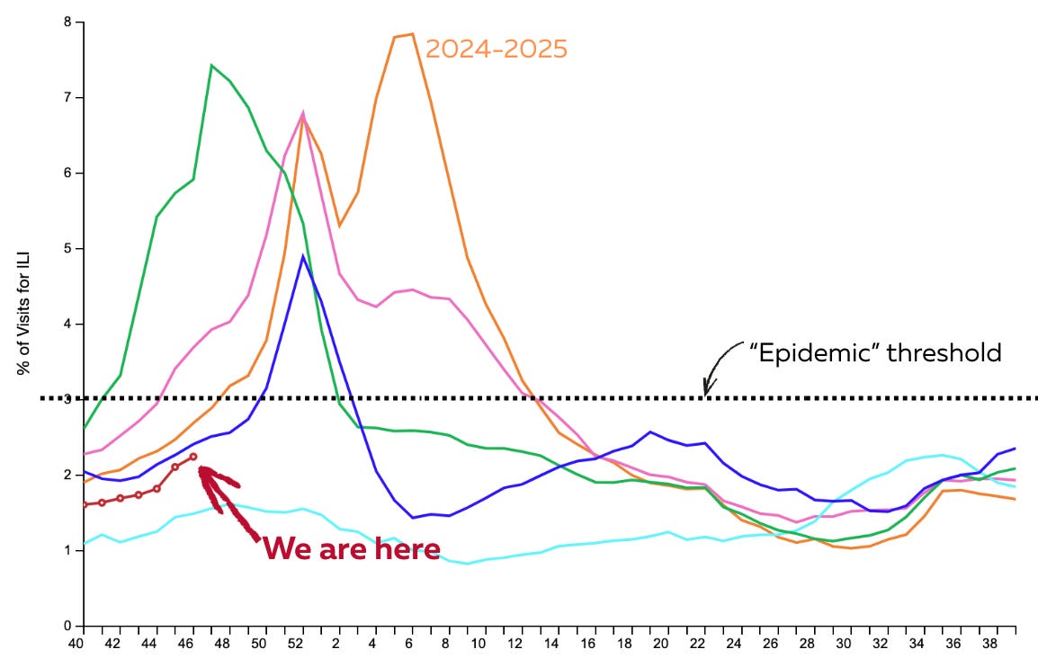 "Colds, fevers, and coughs (also known as influenza-like illnesses, or ILI) are just getting started and haven’t reached the epidemic threshold. That’s great news heading into Thanksgiving, as there’s simply less circulating illness than in previous years, which means a lower chance of getting sick and fewer last-minute cancellations at your table.