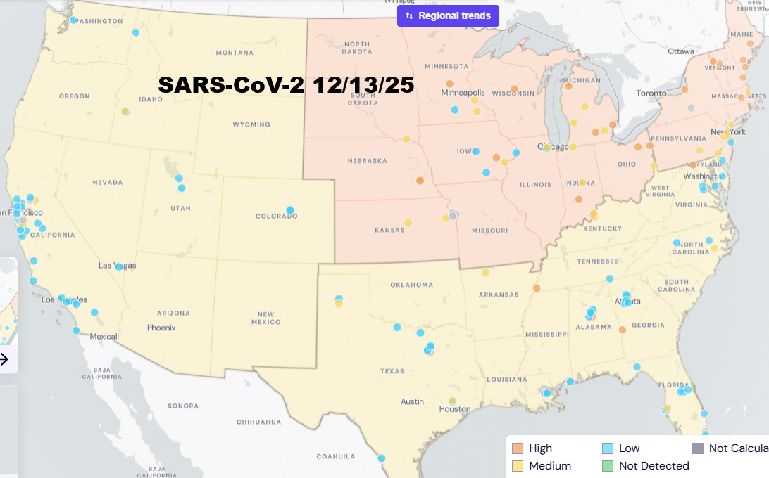 Michael Hoerger used CDC data (last available 11/29/25) and Biobot data and estimates that about 1 in 102 Americans had COVID through November 29th with higher levels in Arizona, Indiana and Vermont. His data will update on Monday.