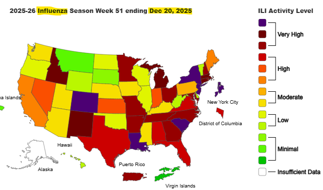 CDC Flu View map is shown through 12/30/25. Data should update tomorrow on 1/5/25 and I anticipate that even more states will be in the Very High to High range for Flu.