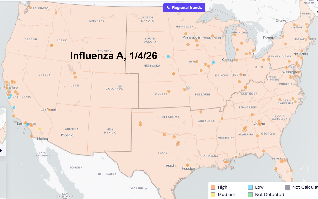 Influenza A in wastewater from WastewaterSCAN as of January 4, 2026: