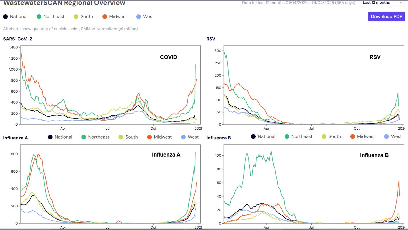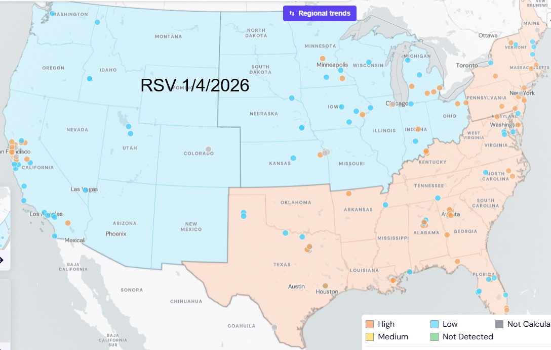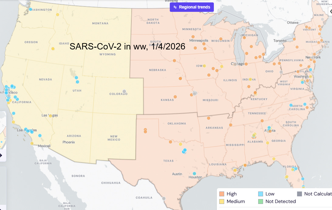 The CDC still reports COVID in wastewater as “LOW”, but their data is old (through 12/20/25) and does not represent what has happened since the holidays. WastewaterSCAN shows that levels of SARS-CoV-2 in wastewater are HIGH in the Northeast and Midwest. If you are sick, home testing can let you know if you have Influenza (more likely) or COVID, so that you can get the correct antiviral medication if needed.