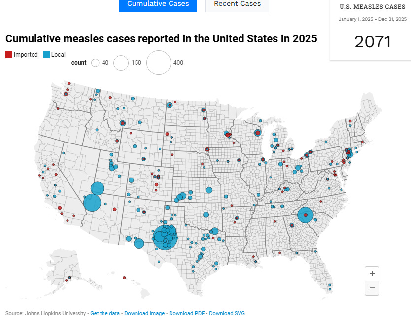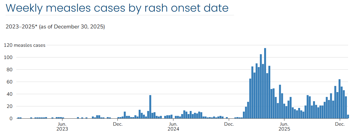 As of December 30, 2025, a total of 2,065 confirmed measles cases were reported in the United States, with 11% of cases hospitalized (235 of 2065), and 3 confirmed deaths from measles. Measles outbreaks are ongoing in South Carolina, as well as in Arizona and Utah.