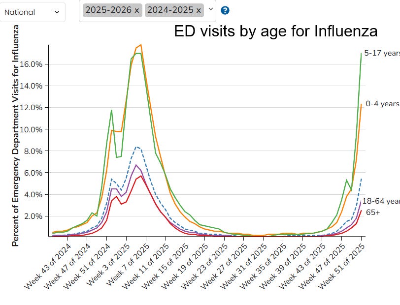 Flu activity is very high now, especially among children. Emergency Department visits and hospitalizations for influenza are elevated, and children account for the highest number of ED visits. The New York City health department notes that the number of flu cases there are already higher than the peaks of the two previous flu seasons and New York state reported the highest number of flu cases ever recorded in a single week.