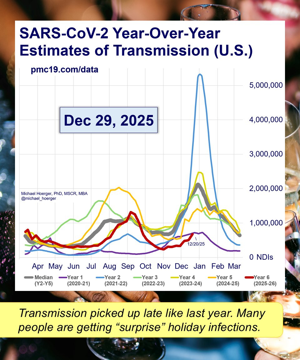 Mike Hoerger notes that the “CDC and Biobot are experiencing holiday-related reporting delays, so we [pmc19.com] will as well.” Using data through December 20th, he estimates that at that time, there were 958,000 new COVID infections per day nationally with 1 in 51 people actively infected with COVID. That number is expected to increase significantly when the CDC reports newer data tomorrow. Of note, Hoerger reports that our COVID wave is starting later this year as compared to past years, so he expects many people will get “surprise” COVID infections after holiday celebrations.