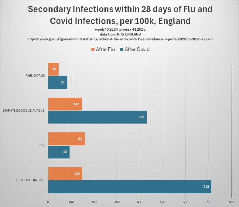 The UKHSA reports show increased risk of secondary infections 28 days after the flu and COVID, with an overall higher risk after COVID. COVID and influenza viruses can affect the immune system’s ability to fight other infections long term.
