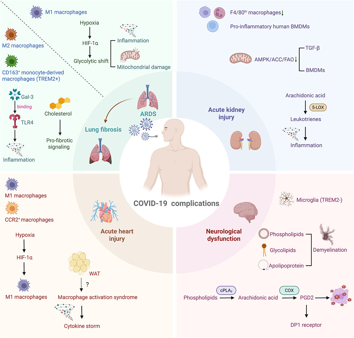Changes to macrophage metabolism by SARS-CoV-2 leads to inflammation and fibrosis. Four metabolic pathways in macrophages are rewired by COVID infection: Glycolysis, TCA metabolism (accumulation of citrate and succinate in mitochondria) and Itaconate, lipid metabolism (Sphingolipids, cholesterol) and metabolism of amino acids glutamine, aspartate, arginine, tryptophan. “Emerging therapeutic strategies target the pharmacological modulation of macrophage metabolic processes using agents such as 2-DG [glycolytic inhibitor], itaconate derivatives, statins, and metformin.”