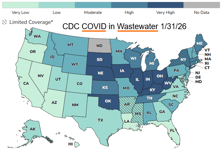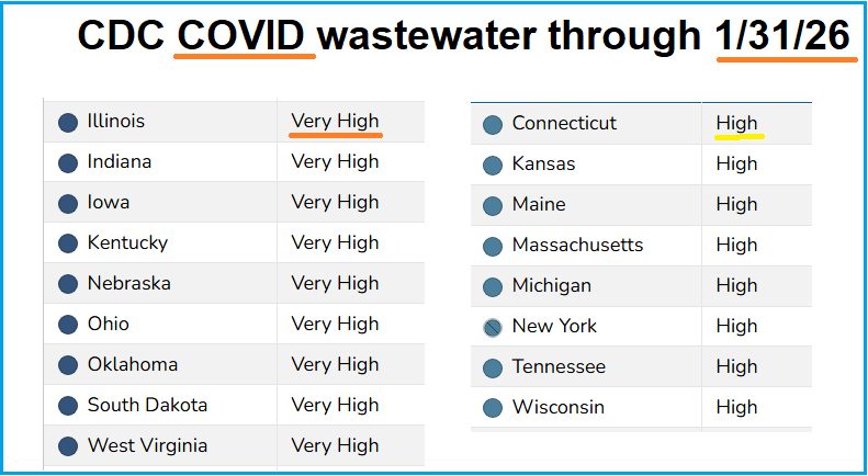 Nationally, about every 1 in 80 people is actively infectious now with COVID, which works out to about 608,000 new COVID infections daily. The Midwest levels of COVID in wastewater are VERY HIGH, while Northeastern states are HIGH.