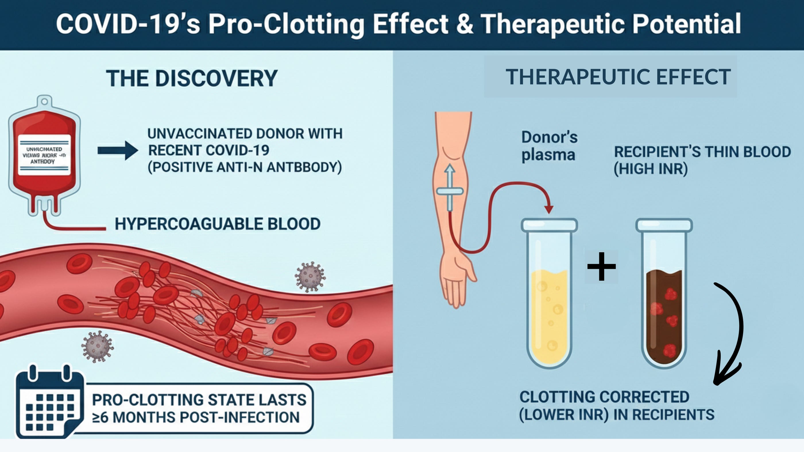 When a person’s blood is not clotting, their INR level increases and they may need to be treated with a plasma transfusion to help decrease their INR to normal and stop any bleeding. A new study shows that the blood of unvaccinated people with recent COVID infection was more hypercoagulable, meaning that it clotted more easily and had a lower INR. Giving this plasma to people whose blood did not clot enough helped to bring their INR down, so that their blood would clot again. This study shows that after a COVID infection, people’s blood may be hypercoagulable for at least 6 months.