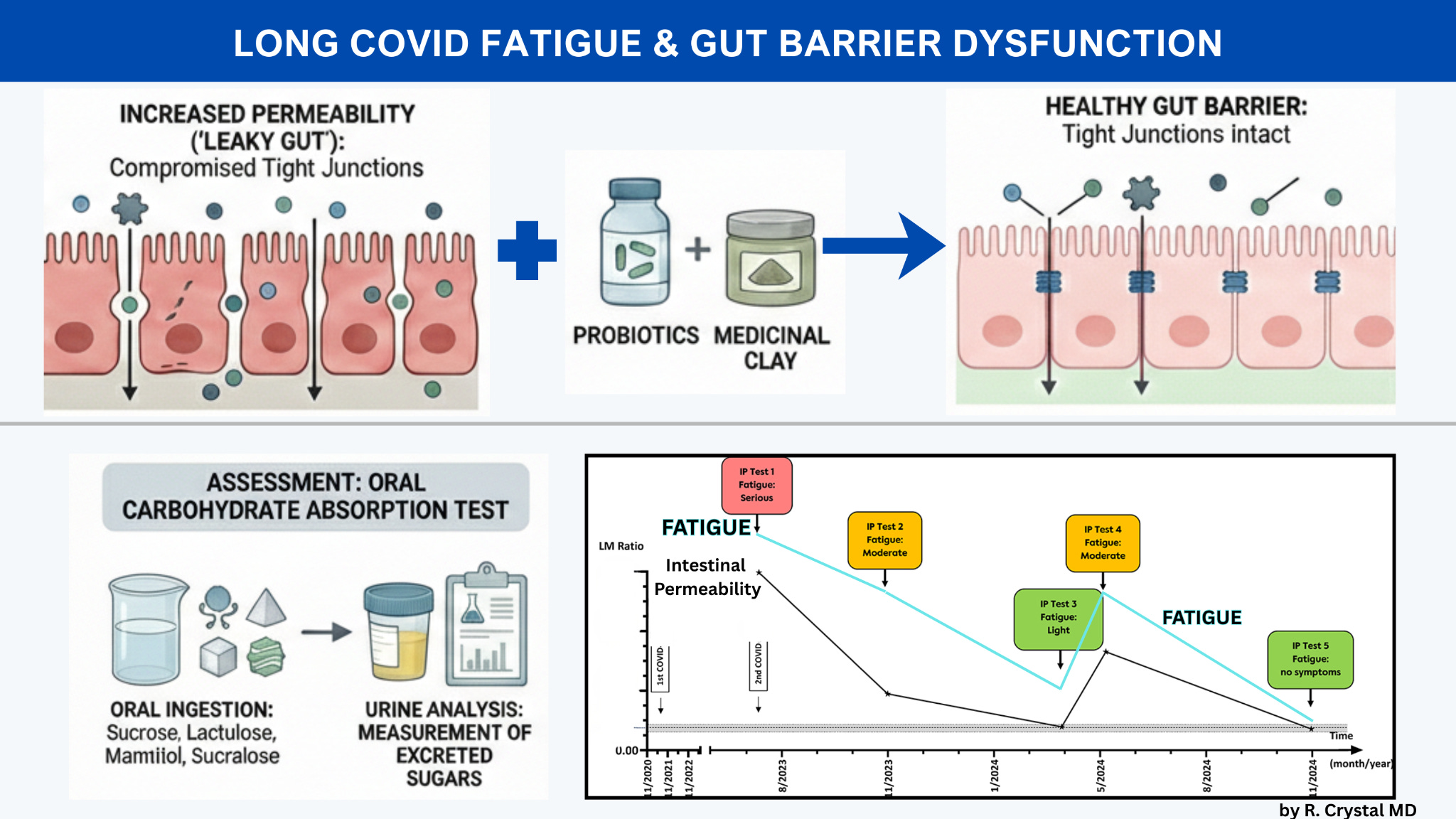 Researchers at Charité in Berlin followed a 60-year-old woman with Long COVID for three years and found that increases in intestinal permeability (“leaky gut”) closely tracked episodes of severe fatigue. Gut permeability was assessed using a carbohydrate absorption test in which four sugars (sucrose, lactulose, mannitol, and sucralose) were given orally and later measured in the urine. Treatment with probiotics and medicinal clay was associated with improvements in fatigue and normalization of gut barrier function. These findings support a role for gut barrier dysfunction in Long COVID fatigue and highlight the need for further research into microbiome-targeted interventions.