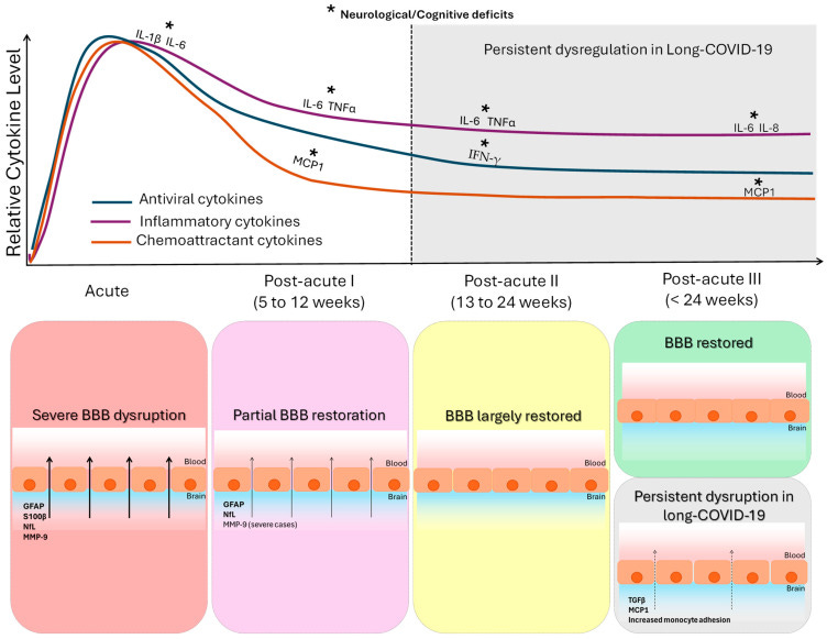 Figure 2: Temporal dynamics of cytokine alterations and blood–brain barrier (BBB) integrity across COVID-19 stages.