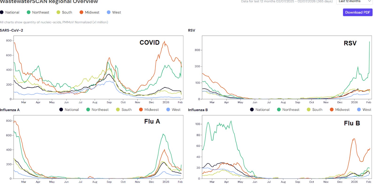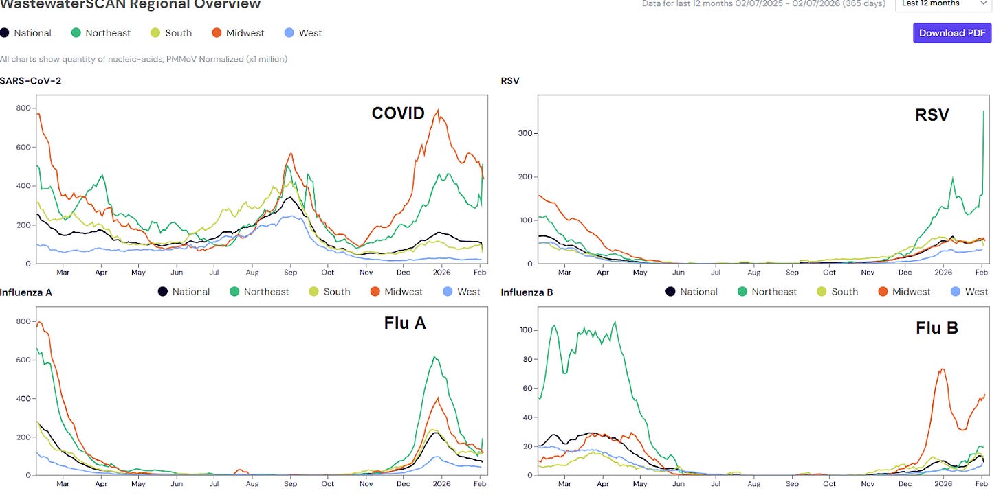 Regional wastewater levels for COVID, RSV, Flu A, Flu B from WastewaterSCAN: