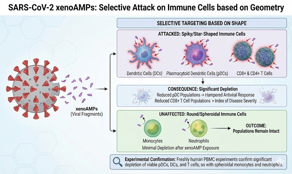 Why are certain immune cells affected in COVID and Long COVID? It turns out that viral fragments of SARS-CoV-2 called xenoAMPs (AntiMicrobial Peptide (AMP)-like sequence motifs) target specific immune cells based on the cell’s geometry. “Cells that are spiky, that are star-shaped, or that have lots of tentacles end up getting preferentially suppressed,” according to Gerard Wong of UCLA. “These “spiky” immune cells include early-warning dendritic cells that detect and alert the rest of the body to viruses, as well as CD8+ and CD4+ T cells that help destroy already infected cells.” Immune cells that are round in shape like monocytes and neutrophils are not decreased by this mechanism.