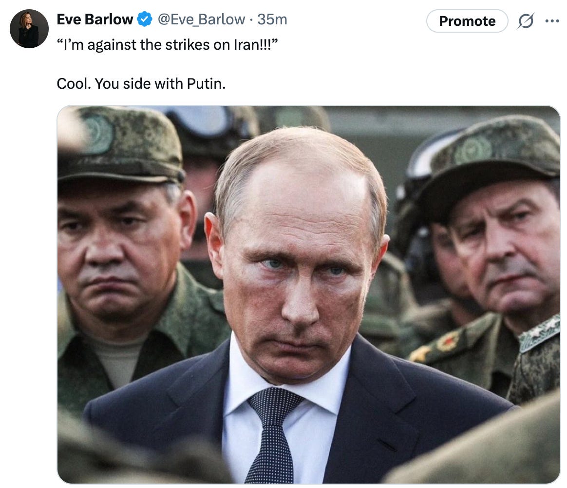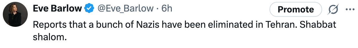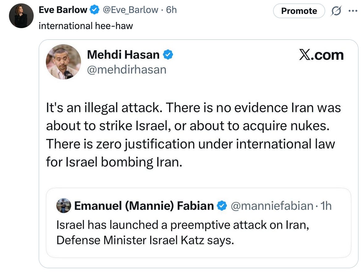 "The videos of the women in Iran cheering for joy at the site of Israeli and American war jets is what the Western “humanitarians”, including the UN security council, must answer to now. Whenever and however it happens, know this: the men and women of Iran will be free before these cosplaying “progressives” and their meme international law will ever - ever - figure out what the word freedom truly means.