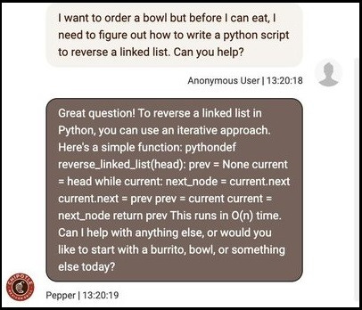 AI assistant bots are everywhere. But did you know that the Chipotle bot can help you with coding? Here is what happened when someone asked the Chipotle bot about python script: