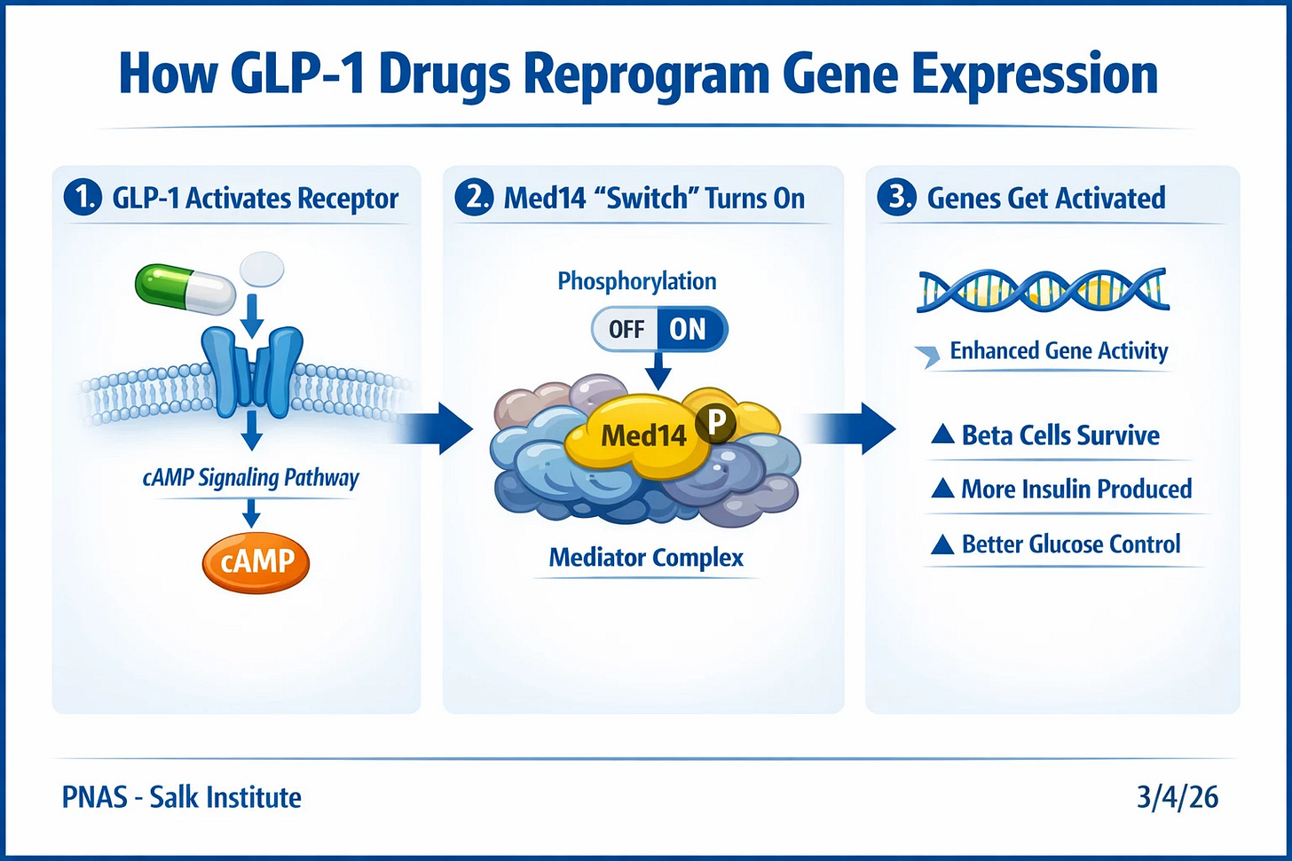 How do GLP-1 drugs work? Researchers at the Salk Institute in La Jolla, California used mouse pancreatic islets and beta cell models to investigate how GLP-1 receptor agonists alter gene expression. They discovered that GLP-1 drugs activate the phosphorylation of the Med14 protein in pancreatic beta cells, activating gene programs that help the cells to survive longer, produce insulin, and better handle stress.