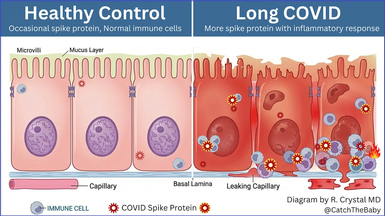 A preprint from the J. Craig Venter Institute and Mount Sinai found SARS-CoV-2 spike protein persisting in gut tissue of both Long COVID patients and healthy controls, but with a key difference: in Long COVID patients, more spike protein was noted and the spike-positive areas showed abnormal immune cell accumulation and overactive inflammation, while the same areas around spike protein in the tissues of healthy controls were immunologically quiet (inert). The findings support viral persistence as a driver of Long COVID and suggest that treatments targeting residual spike protein in tissues may be essential.