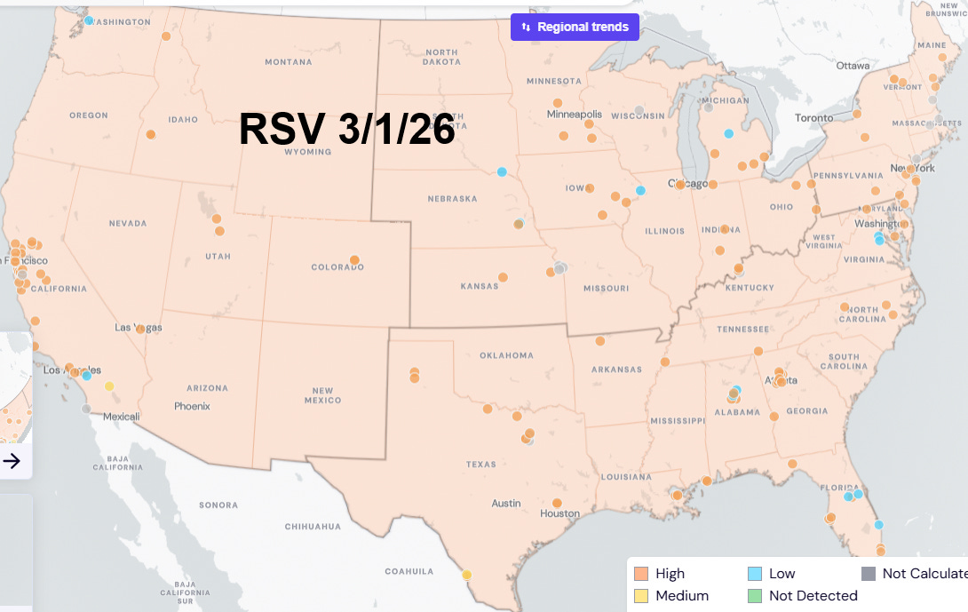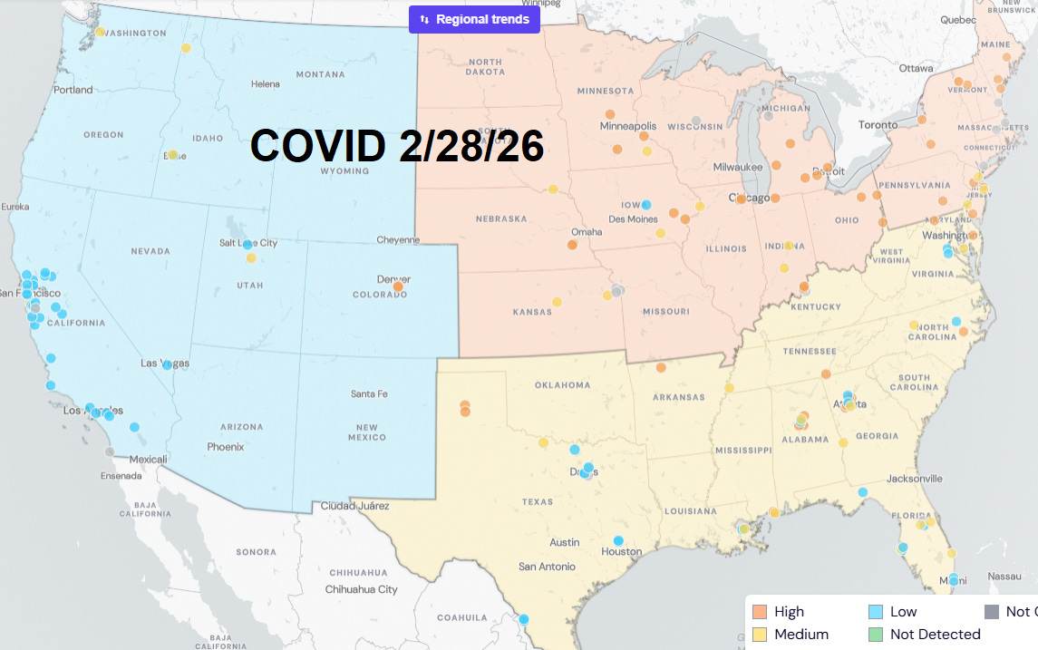 As of 2/28/26, WastewaterSCAN reports HIGH levels of COVID especially in the Midwest and Northeast, although some places are starting to decline. COVID levels in wastewater are LOW in California.
