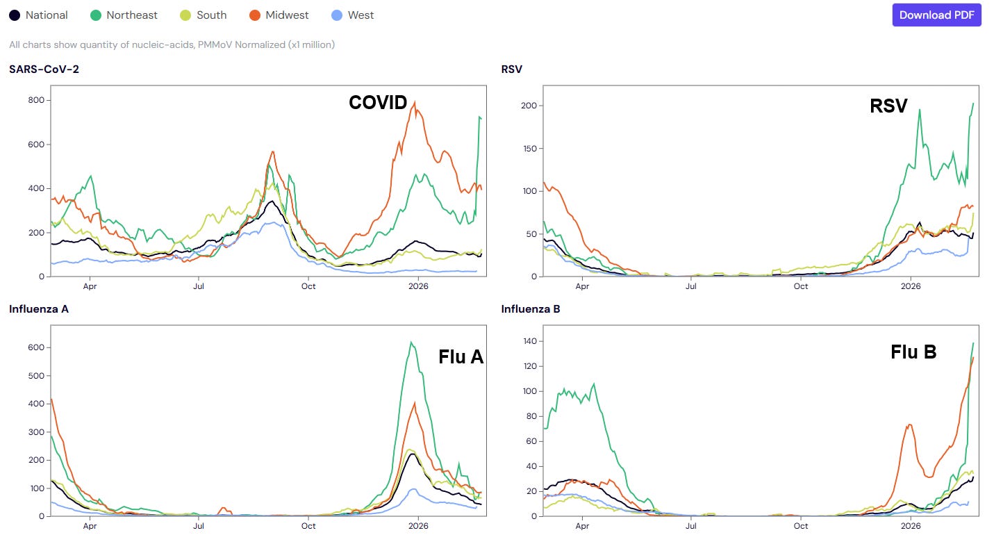 Regional wastewater levels for COVID, RSV, Flu A, Flu B on 2/27/26: