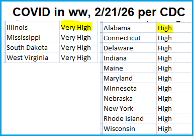 As of a week earlier on 2/21/26, the CDC reported VERY HIGH levels of COVID in wastewater in Illinois, Mississippi, South Dakota and West Virginia.