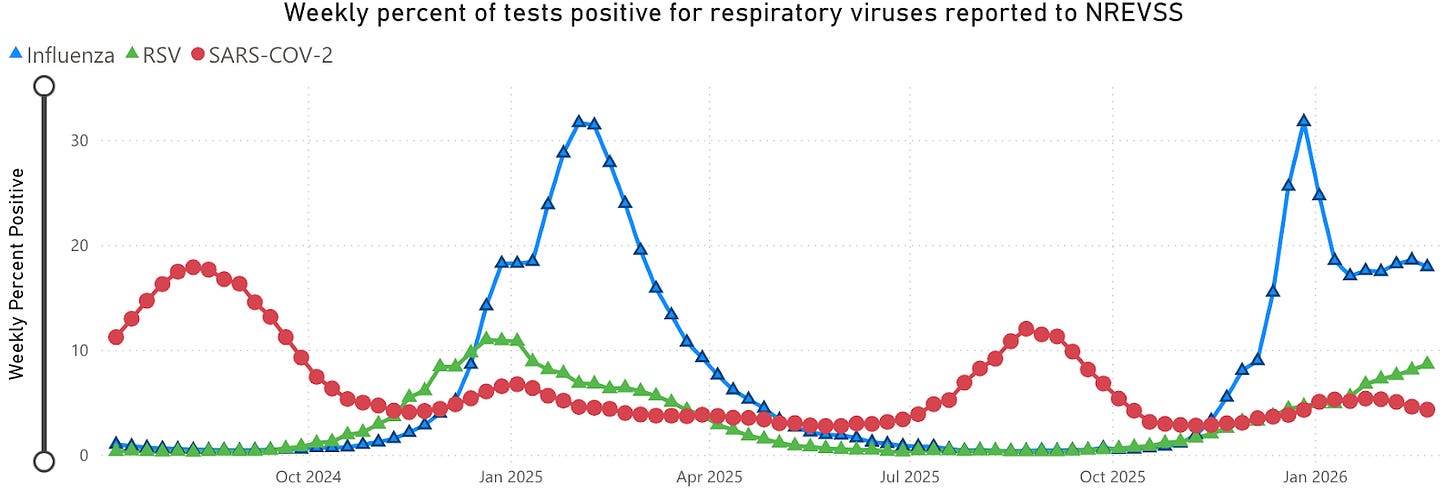 This respiratory season just won’t quit. Flu activity is holding steady. One strain (flu B) is rising while another (flu A) is falling, and together they’re canceling each other out. That kind of plateau is unusual; most seasons follow a smoother up-and-down curve. But the timing isn’t surprising. In bad flu years, activity has stayed above epidemic levels well into mid-March.