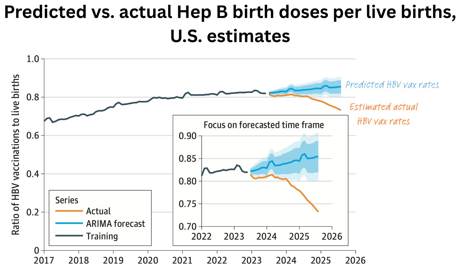 It turns out, quite a lot. For every 100 live births, 10 fewer newborns received the hepatitis B vaccine than models predicted. The decline began in late 2024 and now appears to be accelerating. (Note: The study period ended before RFK Jr. made the unilateral decision to stop recommending the hepatitis B vaccine for all newborns. That means the downward trend will continue.)
