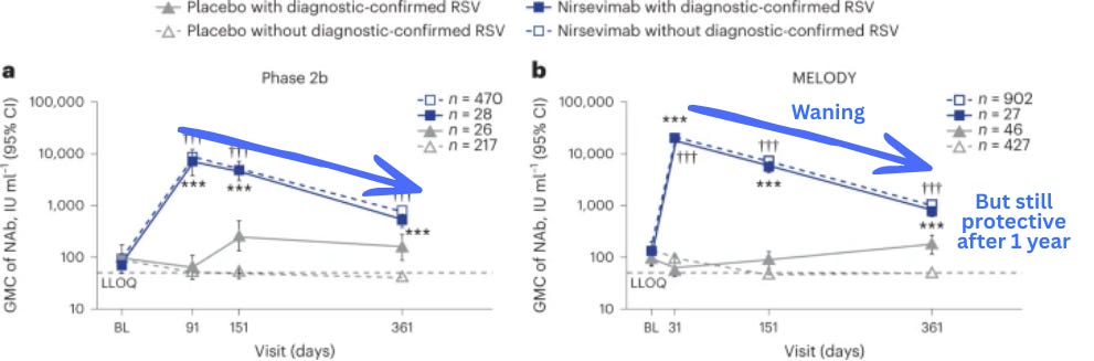 For RSV: If your infant received monoclonal antibodies (like Nirsevimab) this season, they’re likely still protected. Most monoclonal antibodies fade quickly, but the RSV ones were specifically engineered to last longer. Nirsevimab has a half-life of about 70 days—meaning the amount in the body decreases by half roughly every 70 days. Even so, studies show protective levels can persist for more than a year. So even doses given early in the season should still be providing coverage.