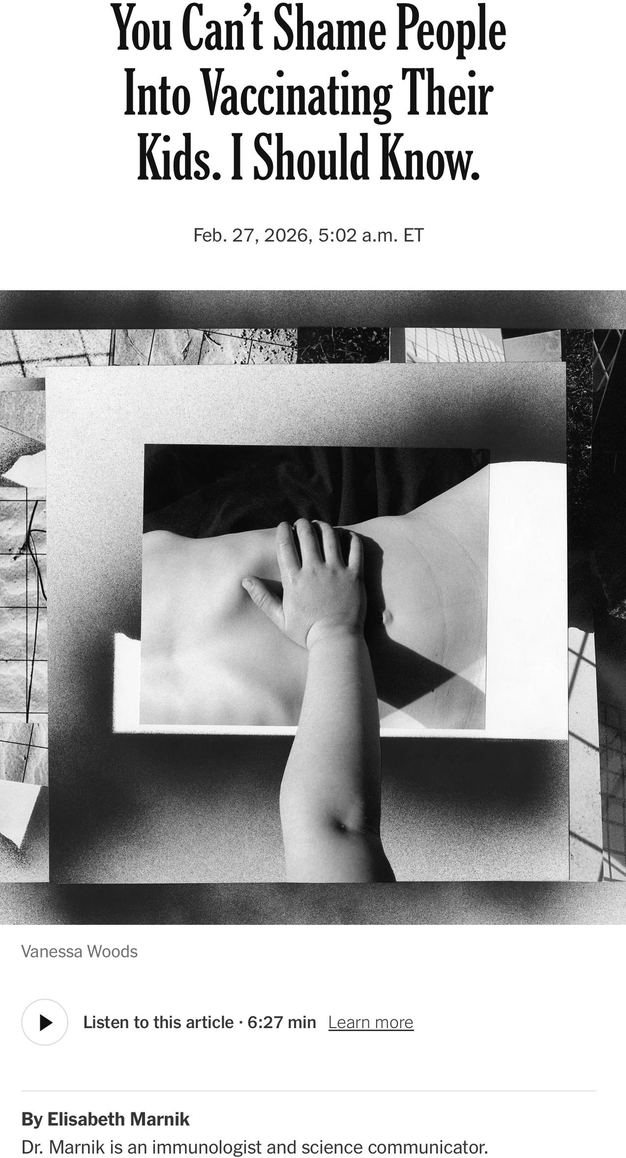 YLE’s own Liz Marnick published an op-ed in the NYT on Friday. I know I’m biased, but it’s a must read. Liz shares her story of growing up unvaccinated, hard conversations with her mother, and going on to study the immune system. And yet, when it came time to vaccinate her own child, she paused:
