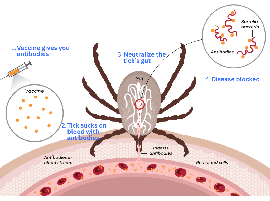 The vaccine works differently from most other vaccines in a very cool way. Instead of just protecting you, it actually works inside the tick: