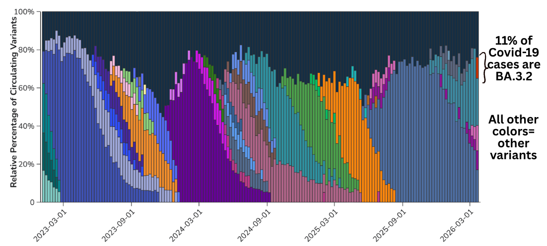 BA.3.2 now accounts for 11% of U.S. cases, but it’s too early to tell how quickly it’s growing. What is clear is that it has yet to trigger a surge. Wastewater levels, emergency department visits, and hospitalizations all remain low. Historically, a variant doesn’t drive a significant new wave until it reaches ~50% of cases.