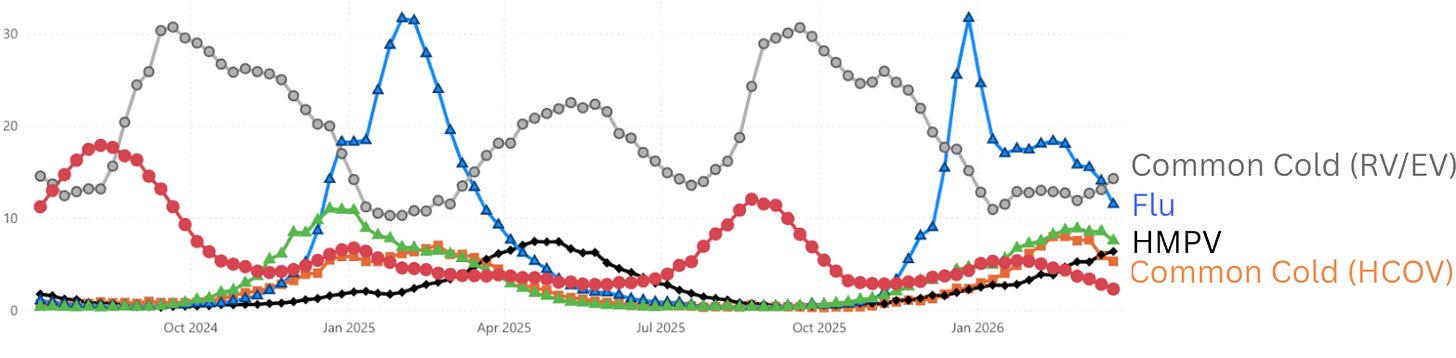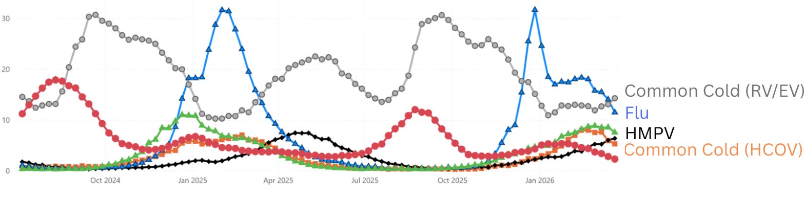 Good riddance, flu season. We are officially out, as rates have now fallen below the “epidemic threshold.” Some states are still high, like New Mexico, but the trend is the same. The other main fall/winter viruses, including RSV and Covid-19 are all decreasing, too.