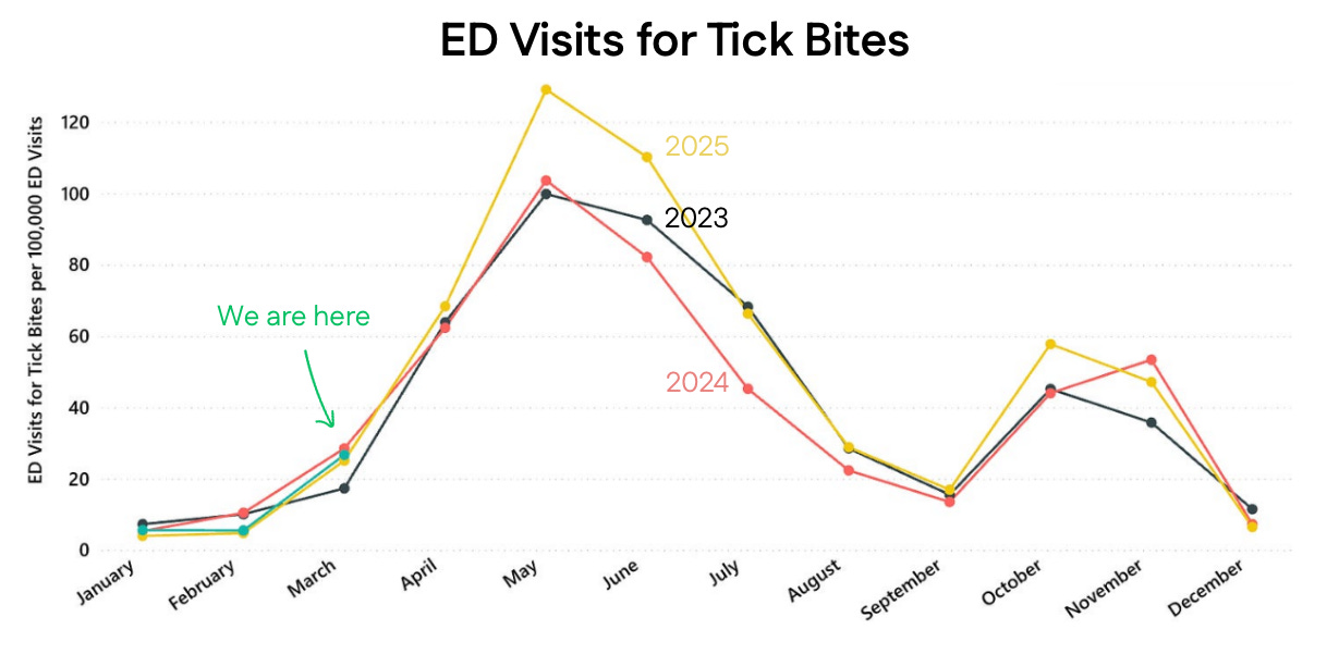 Enter tick season. Emergency department visits for tick bites are low but climbing, which is normal for this time of year. Expect two waves: one peaking in May and another in mid-October. By year’s end, more than 500,000 people will likely be diagnosed and treated for Lyme disease.